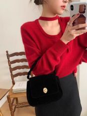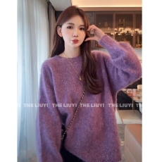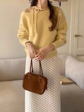 Lazy Style Rabbit Hair Tie-up Shoulder Knitted Sweater for Women Winter Loose Casual Woolly Top