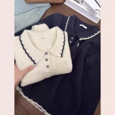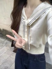 New 2025 Autumn/Winter Sweater Top, Unique Trendy Navy Collar Shawl Style, Fitted Short Length Knit Shirt for Women