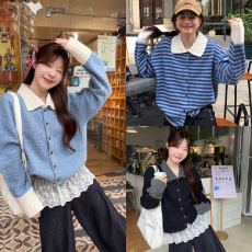 Elegant Korean Color-blocking Collar-button Knit Sweater for Women, Loose and Soft, Youthful and Versatile Wool Sweater for Autumn