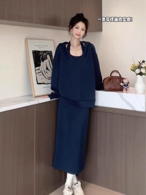 Korean-style relaxed knit cardigan jacket with halterneck strap vest—two-piece autumn/winter set featuring a premium, soft, and cozy sweater suit.