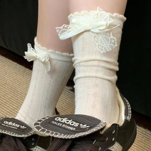 "Girl Rearing Series" Creamy Floral Lace Butterfly Knot Sheer Mid-Calf Socks Sweet JK Socks